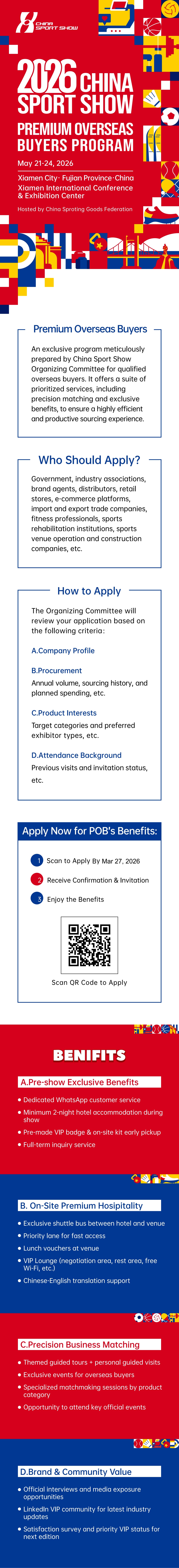 以下是2026年“优质海外买家计划”(POB)的核心内容与申请方式说明,中国体博会组委会诚邀海外买家自主报名参与的同时,也鼓励各参展企业一键转发推广图片(原图详见文末附件),共同邀约来自全球的专业买家。