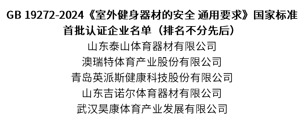 早在今年3月,中体联认证提前布局,启动了室外健身器材产品认证证书换发专项工作——针对依据2011版国标颁发的认证证书,企业可通过免费换证服务实现合规升级。就在近日,中体联认证向山东泰山体育器材有限公司、澳瑞特体育产业股份有限公司、武汉昊康体育产业发展有限公司、山东吉诺尔体育器材有限公司颁发了首批新国标产品认证证书。