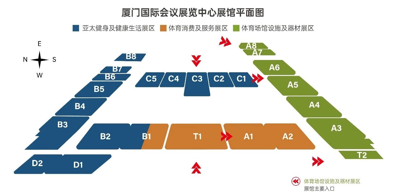 2026年中国体博会体育场馆设施及器材展区涵盖了专业运动地材、体育工艺、专业体育器材及全民健身器材等核心板块。从展区规划及展馆分布来看,2026中国体博会体育场馆设施及器材展区共使用厦门国际会议展览中心的7个展馆——A2-A8馆及T2大棚,位置均在一层展厅。