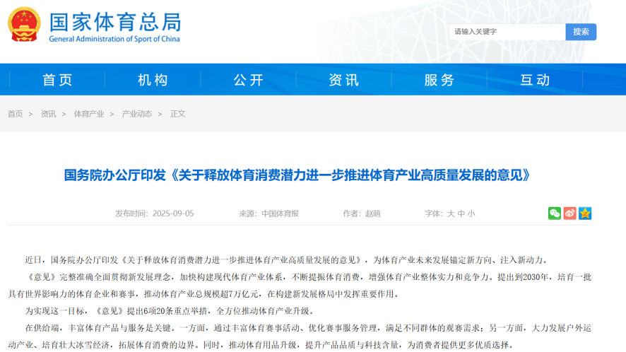 国务院2025年发布的“释放体育消费潜力20条”明确提出,到2030年体育产业总规模突破7万亿元,并通过赛事扩容、消费券发放、税收优惠等“组合拳”激活市场。随后,就在今年9月初,国务院办公厅印发实施《关于释放体育消费潜力进一步推进体育产业高质量发展的意见》,对提振体育消费提出全新要求,通过政策引导推动全民健身与消费升级,聚焦技术创新与服务优化,深化市场开放与合作。