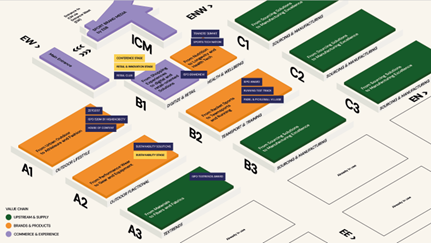 其二,上游与供应链展区(Upstream & Supply)——由A3/B3/C1/C2/C3五个展馆组成。作为驱动行业创新的“引擎”,该展区将幕后的材料科学、生产工艺推至台前,集中展示了全球最前沿的高性能可再生面料、低碳制造技术和柔性供应链解决方案。