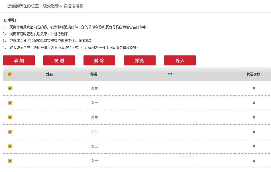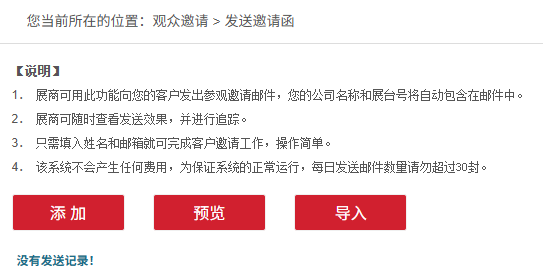 3、进入新页面阅读有关说明后,点击“添加”。注意:用此功能向您的客户发出参观邀请邮件,您的公司名称和展台号将自动包含在邮件中,您可随时查看发送效果,并进行追踪。该系统不会产生任何费用,为保证系统的正常运行,每日发送邮件数量请勿超过30封。