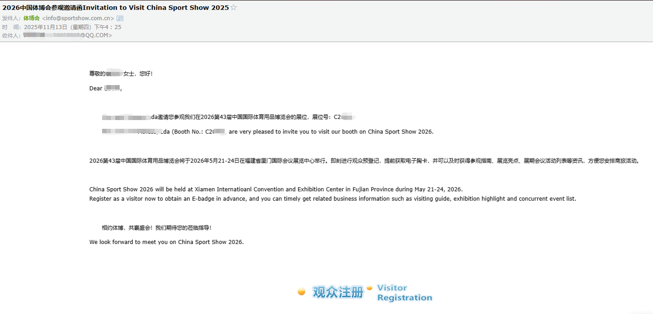 6、客户将收到一封来自组委会的邀请函,其中包含参展企业的名称。在邀请函中点击“观众注册”,填写并提交信息后,即可免费获取2026中国体博会参观门票;同时,还将及时获得参观指南、展览亮点及展期会议活动列表等资讯,以便高效安排商旅行程。