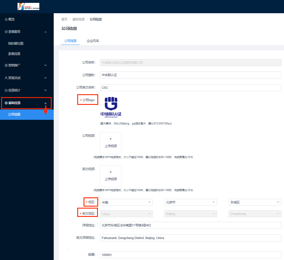 步骤1:点击左侧“基础信息”→“公司信息”,按要求填写内容并上传公司Logo与信息。