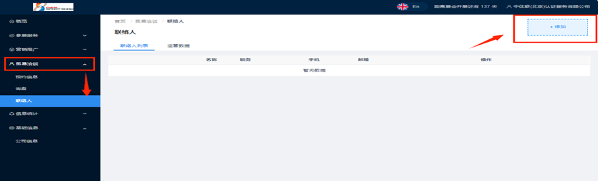 步骤1:点击“贸易洽谈”→“联络人”,再点击页面右侧“添加”,录入公司业务对接人信息。