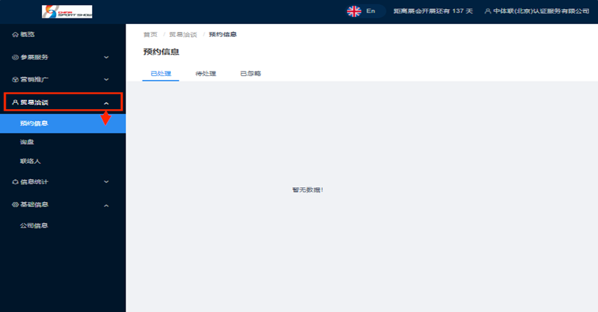 步骤3:点击“贸易洽谈”→“预约信息”→“待处理”,可查看公司收到的预约信息。