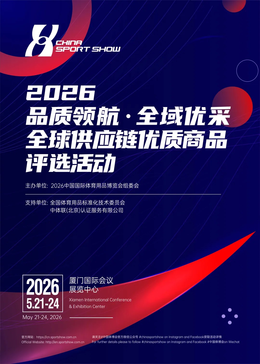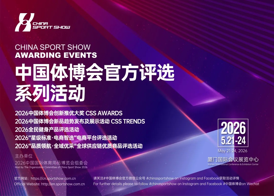 2026中国体博会官方评选系列活动具体由以下五个评选项目组成,分别是:2026中国体博会创新推优大奖CSS AWARDS、2026中国体博会新品趋势发布及展示活动CSS TRENDS、2026全民健身产品评选活动、2026“星级标准·电商智选”电商平台评选活动、2026“品质领航·全域优采”全球供应链优质商品评选活动,旨在通过一系列权威且专业的评选与展示活动,挖掘体育用品产业领域内的创新力量与优质产品,为行业树立标杆与典范。