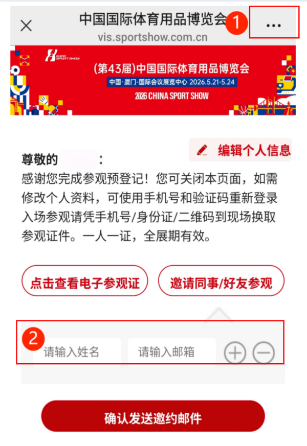 ①在确认页面点击右上角“…”,可通过微信转发给朋友或分享到朋友圈,邀请报名参观。