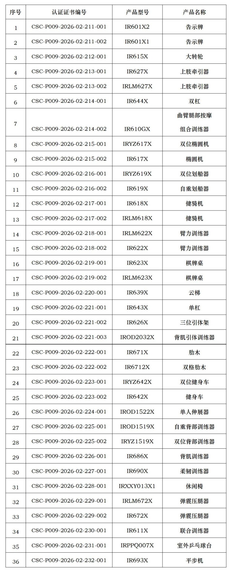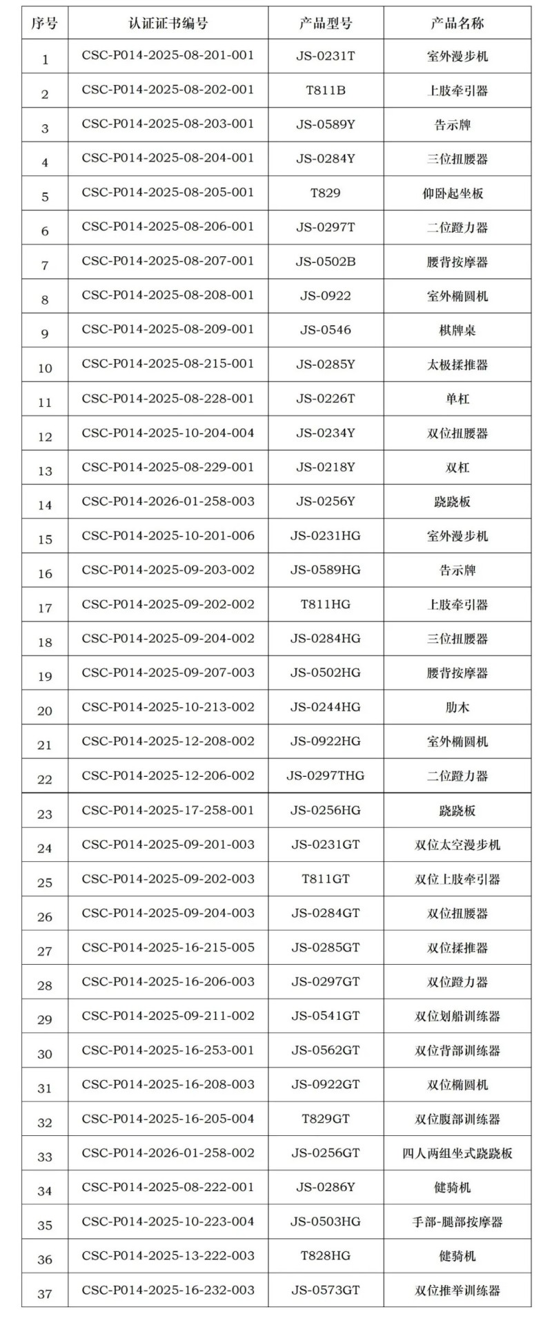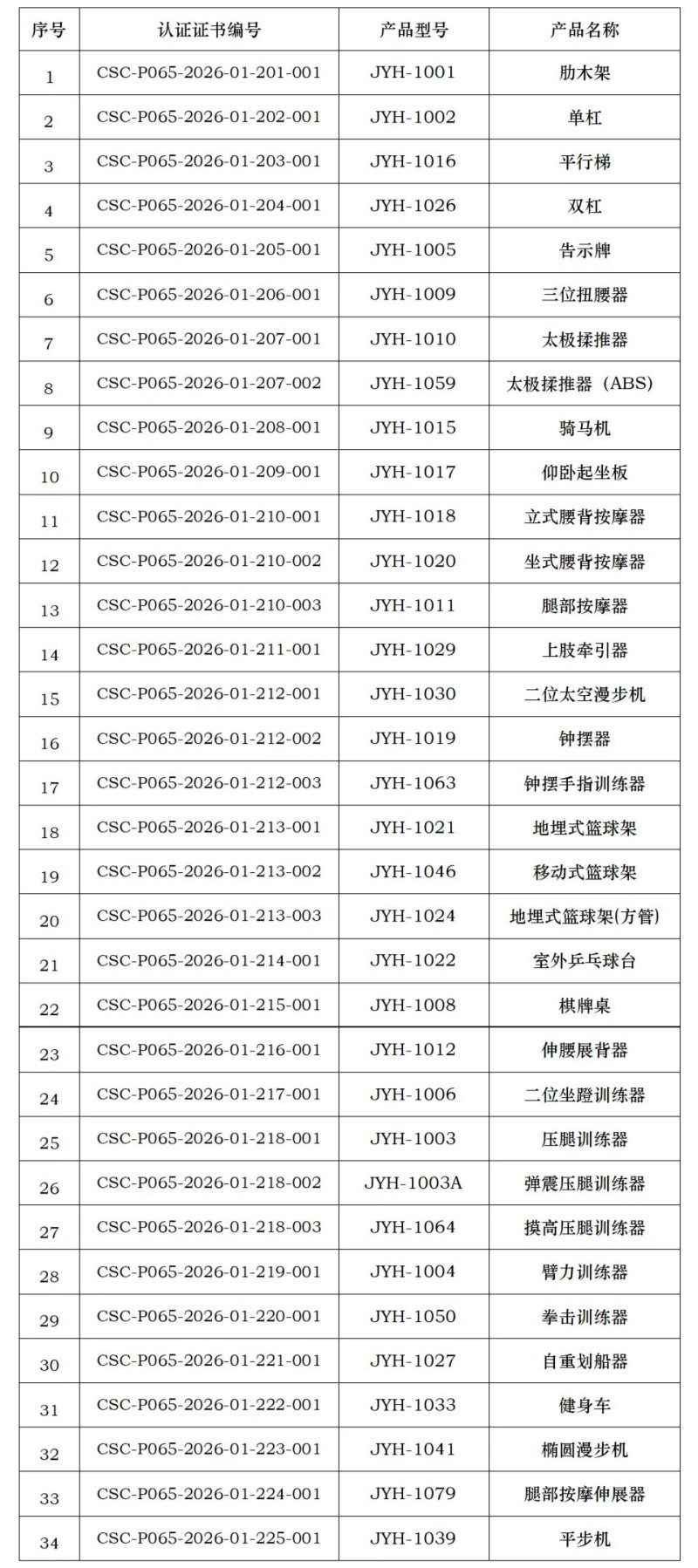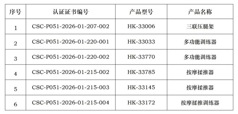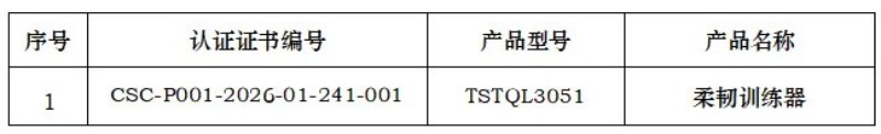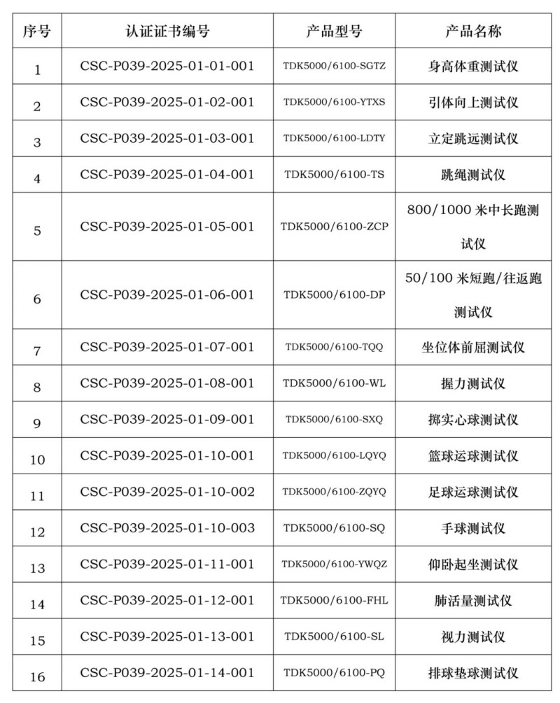 近期,宁波浙鼎教育科技有限公司、山东泰山体育器材有限公司、南通铁人运动用品有限公司、青岛驰健英赛特健康科技有限公司、江苏加一健康科技有限公司、武汉昊康体育产业发展有限公司、河北康奥达体育用品有限公司、澳瑞特体育产业股份有限公司(排名不分先后),获得由中体联(北京)认证服务有限公司颁发的产品认证证书,证书明细如下,特此公告。