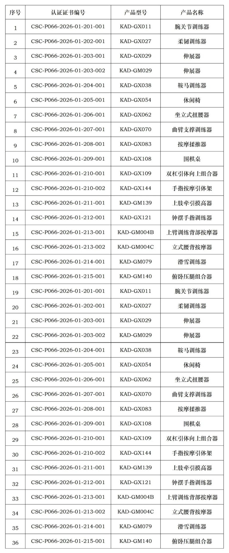 河北康奥达体育用品有限公司,证书明细如下(共36张):