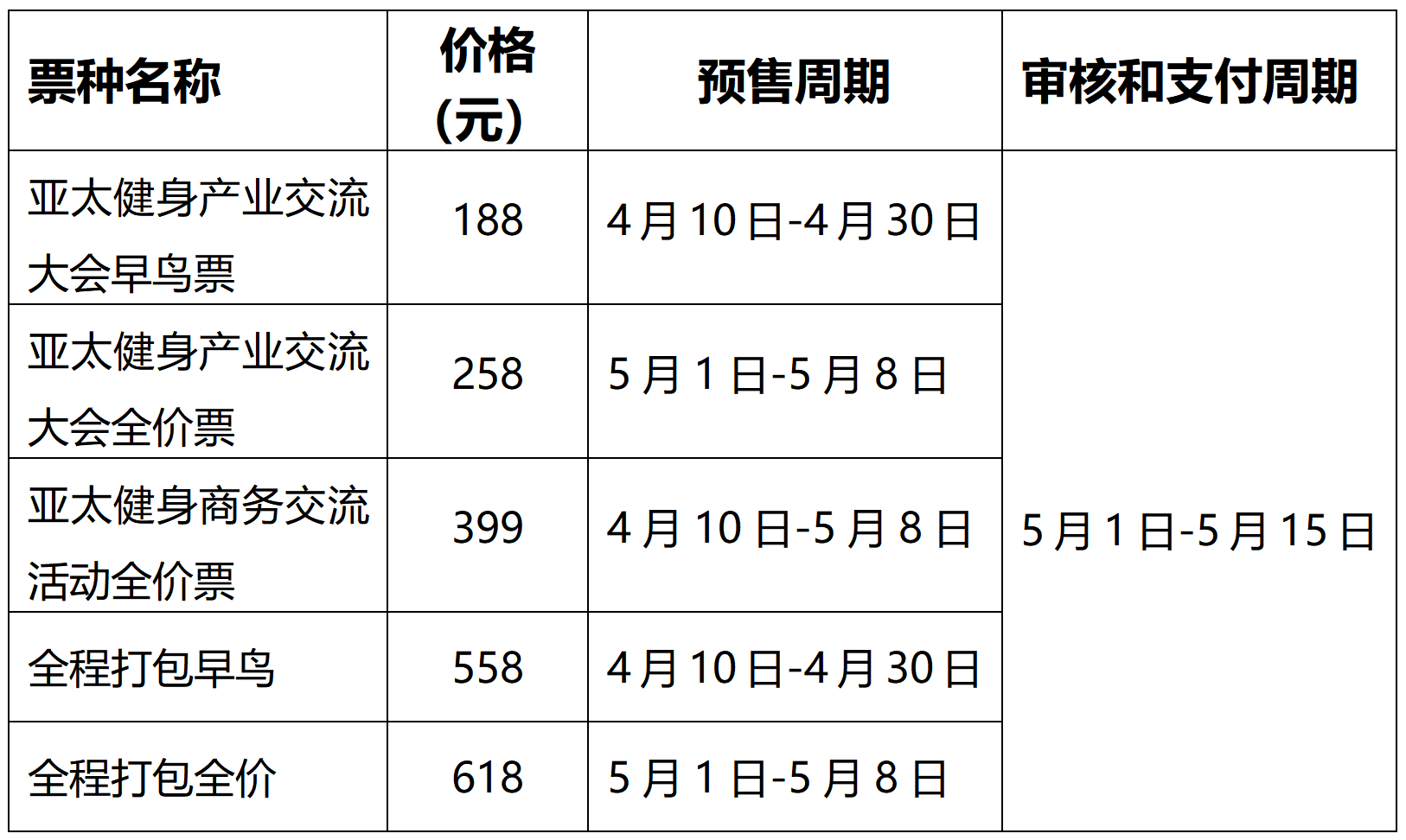 本次活动票种包含以下类型:亚太健身产业交流大会早鸟票、亚太健身产业交流大会全价票、亚太健身商务交流活动全价票、全程打包早鸟票、全程打包全价票。不同票种的价格与预售周期各有差异,但审核及支付周期保持一致。
