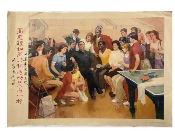 庄则栋签名的球拍和宣传画