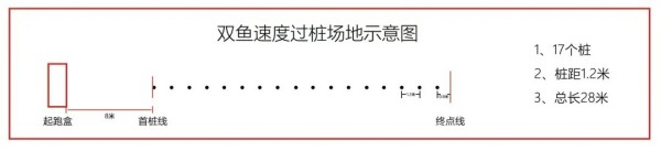 1、场地布置:起跑盒为2m*40cm的矩形,起跑盒主线与首桩中心线垂直,桩间距为80cm,桩数为20个,终点线距尾桩80cm,总比赛距离为16m。