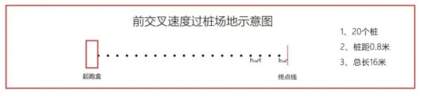 起跑盒为2m*40cm的矩形,起跑盒主线与首桩中心线垂直,桩间距为80cm,桩数为15个,起点和终点线距首尾桩均160cm,总比赛距离为14.4米。